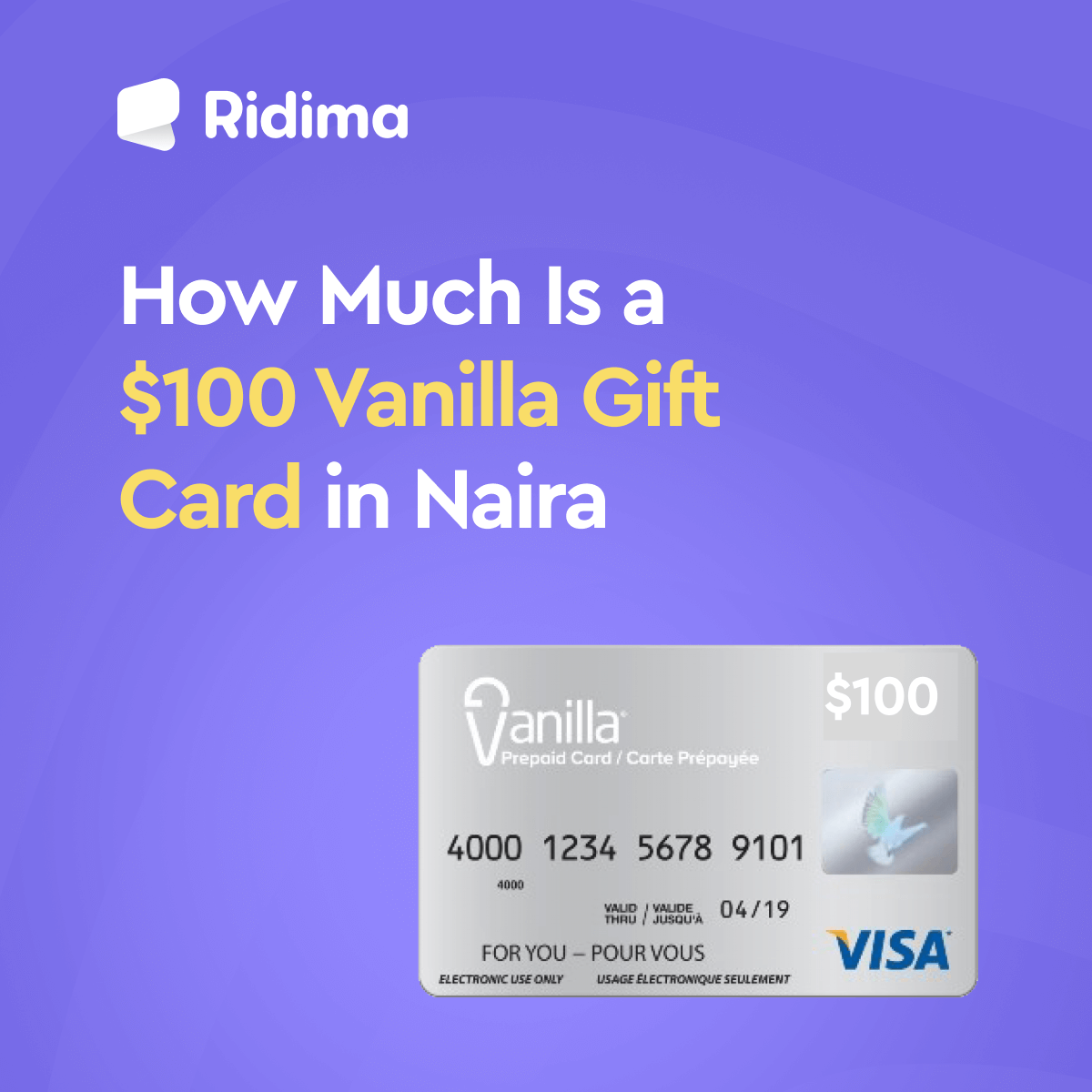 Ridima offers a secure and reliable way to sell your $100 Vanilla gift card in Nigeria, with fast verification, competitive rates, and instant payouts. Convert your Vanilla gift card to Naira quickly and safely on the best gift card trading platform in Nigeria. Trade with Ridima.