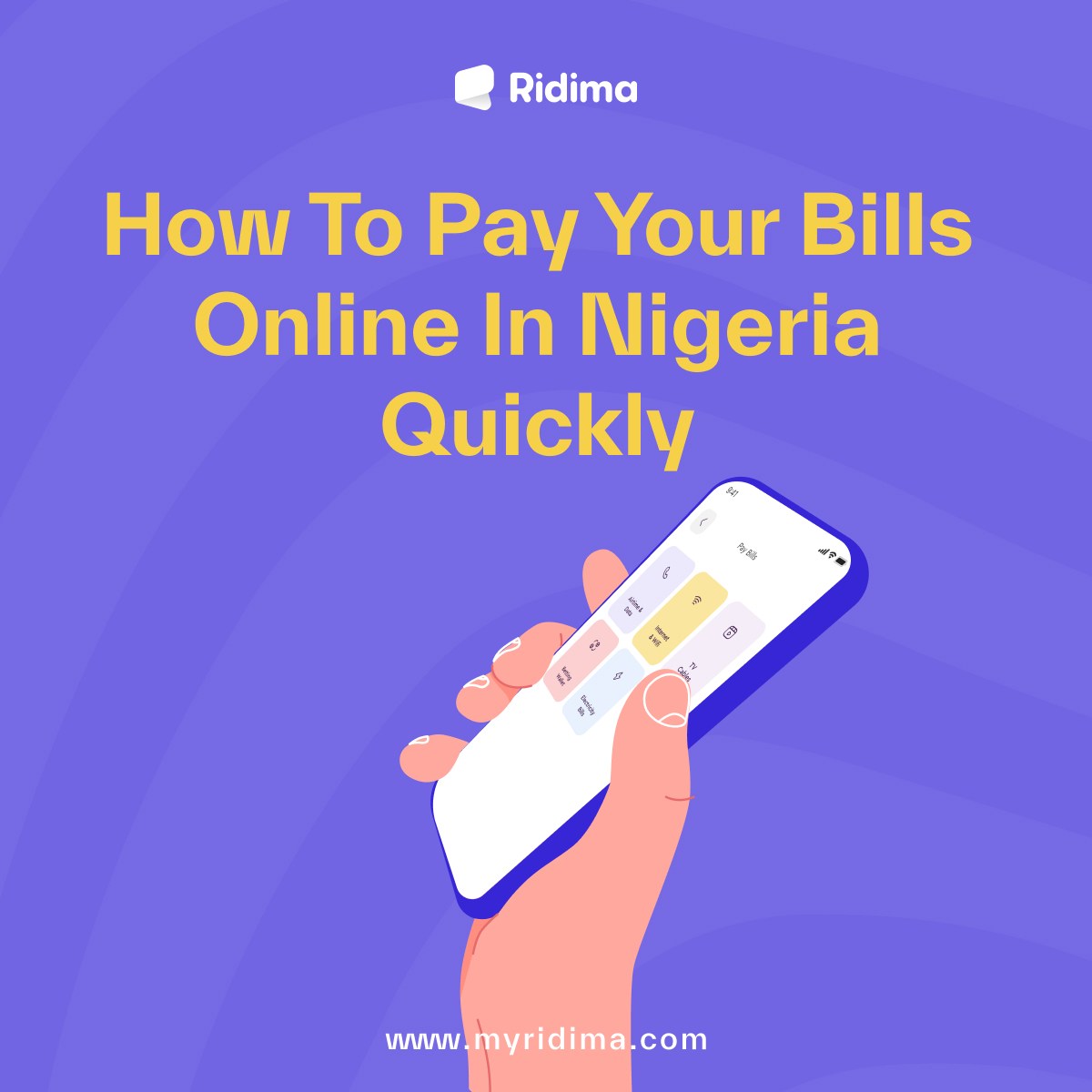 Your Ridima wallet allows you to pay for electricity, TV cable, Internet and WiFi, airtime and data, and fund betting wallet platforms.